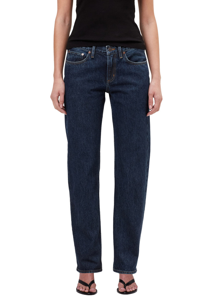 The Low Rise Slim is a sleek, straight silhouette designed to sit low on the hips with a close fit through the leg. This pair, crafted from rigid, non-stretch denim in a medium vintage indigo, is finished with soft fading and subtle marbling for an authentically worn-in feel. Pairs perfectly with a classic tee or tucked-in blouse.