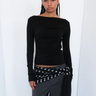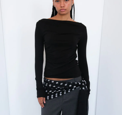 The Drew- A draped neck long sleeve top. Made from a super stretchy semi sheer knit fabric. Features an asymmetric hem.