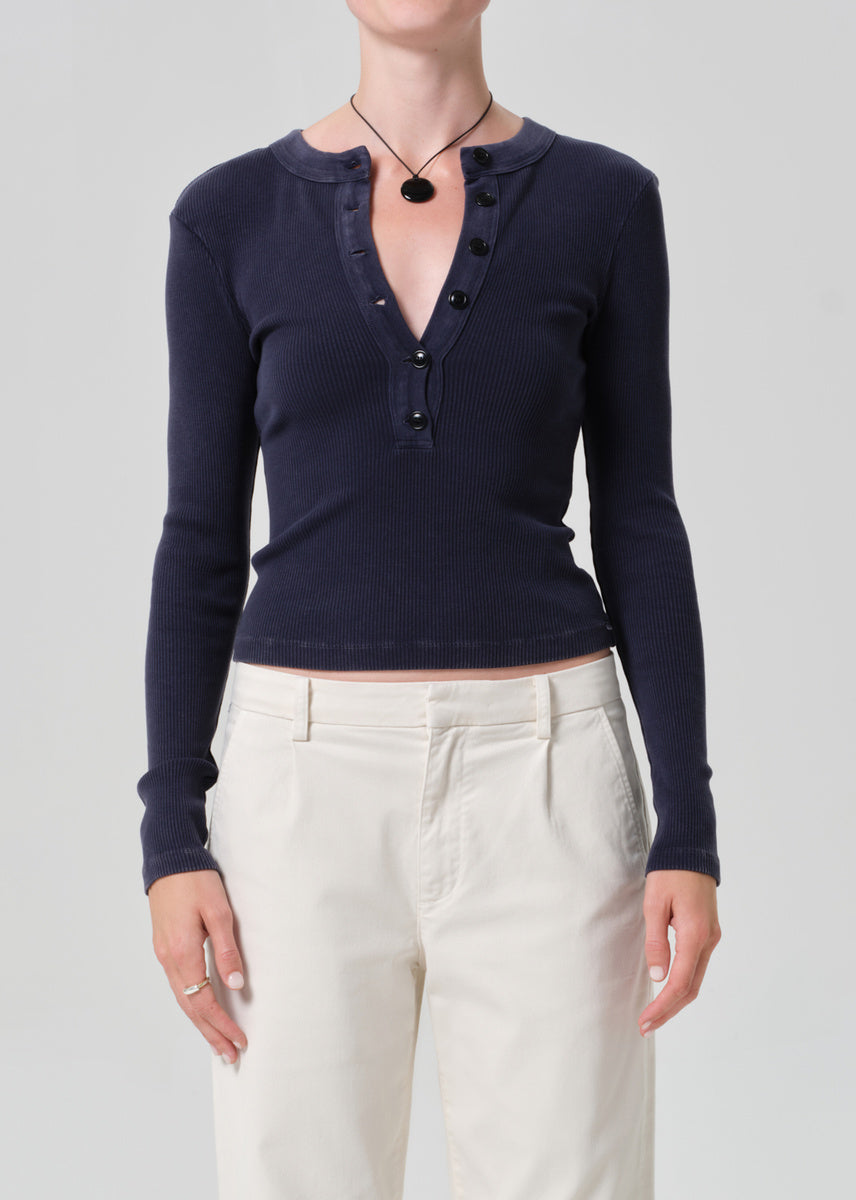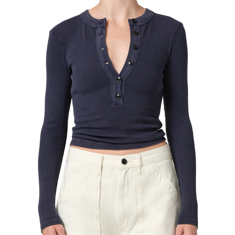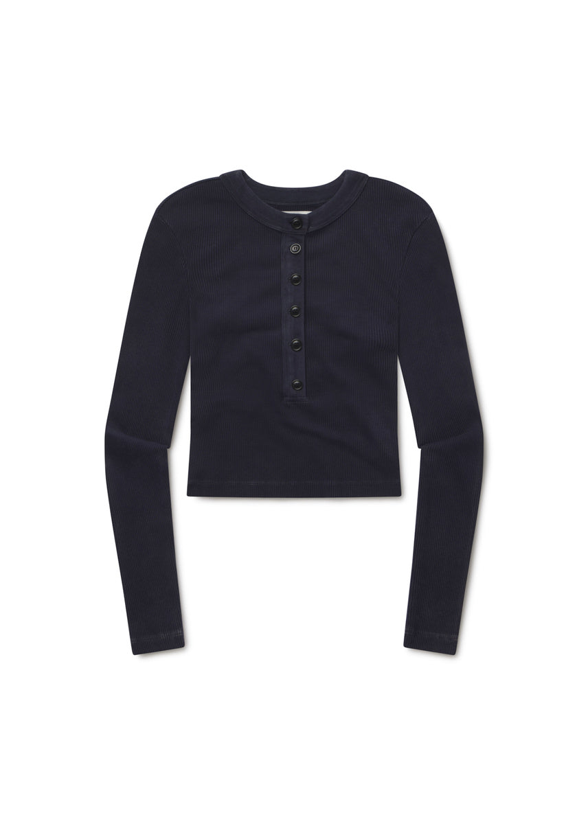 The Varra Henley is a timeless women’s long sleeve top designed for comfort and modern style. Crafted from ultra-soft, supportive rib made with regenerative cotton, this slim-fitting henley contours the body while offering natural stretch and breathability. Featuring a clean button placket and a flattering neckline, it’s a versatile essential—perfect for layering or wearing on its own.
