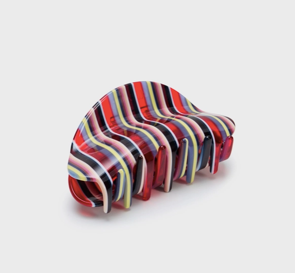 This medium sized hair claw is super versatile and works for all hair types and textures. Made from high quality acetate; a durable, plant based bio-plastic. Metal hardware is lead and nickel-free. Slight variations will appear with pattern, color and form due to the handmade nature of the product. Measures approx 3.5"L x 1.75"H x 1.75"D Color: multicolor stripe, red, yellow, blue, black, silver tone hardware