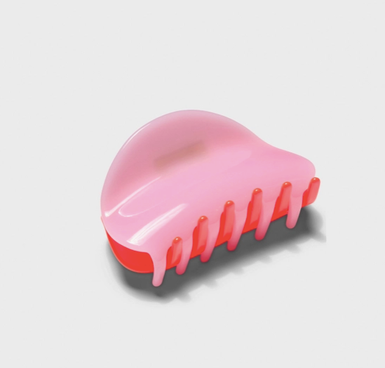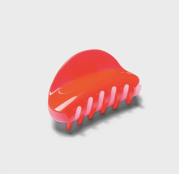 This medium sized hair claw is super versatile and works for all hair types and textures. Made from high quality acetate; a durable, plant based bio-plastic. Metal hardware is lead and nickel-free. Slight variations will appear with pattern, color and form due to the handmade nature of the product. Measures approx 3.5"L x 1.75"H x 1.75"D Color: multicolor stripe, red, yellow, blue, black, silver tone hardware