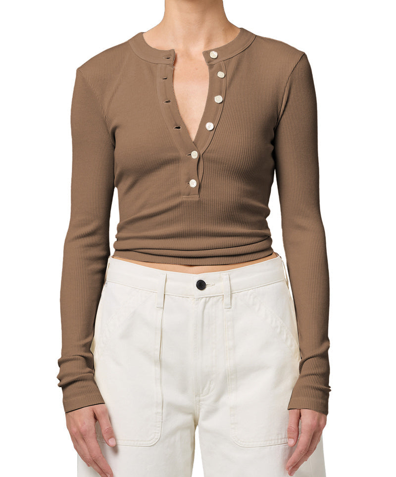 The Varra Henley is a timeless women’s long sleeve top designed for comfort and modern style. Crafted from ultra-soft, supportive rib made with regenerative cotton, this slim-fitting henley contours the body while offering natural stretch and breathability. Featuring a clean button placket and a flattering neckline, it’s a versatile essential—perfect for layering or wearing on its own.