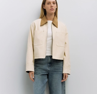 Crafted from heavy duck twill with a fully lined interior, the Laurel Jacket features a contrast crewneck collar, full zipper, and patch pockets with rivet details. Long sleeves with partial cuffs and back pleats offer ease of movement, while the relaxed fit blends practicality with contemporary style.