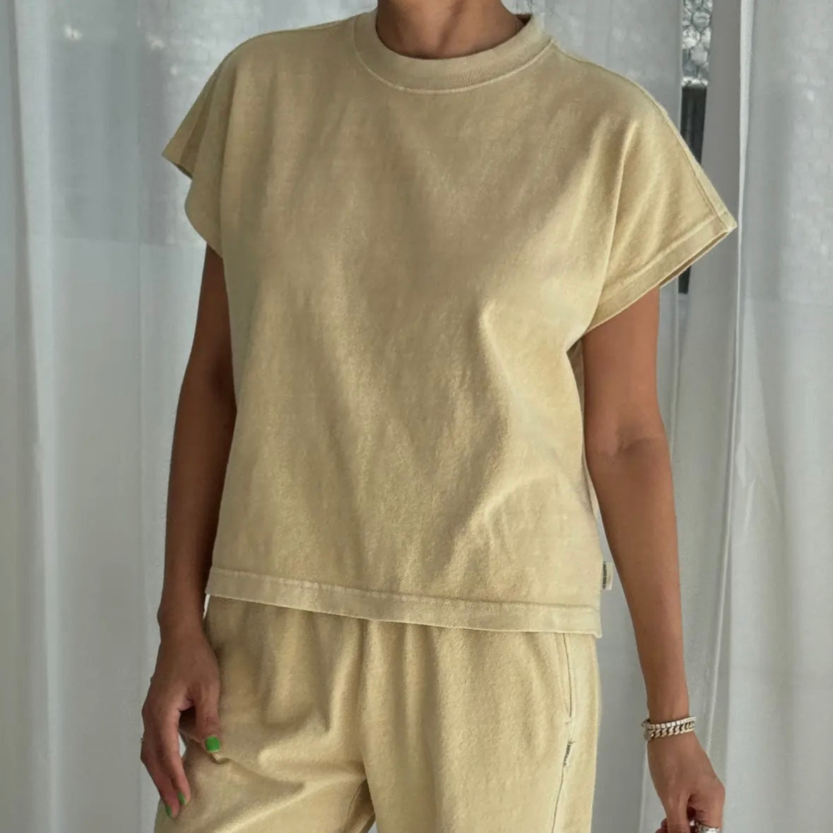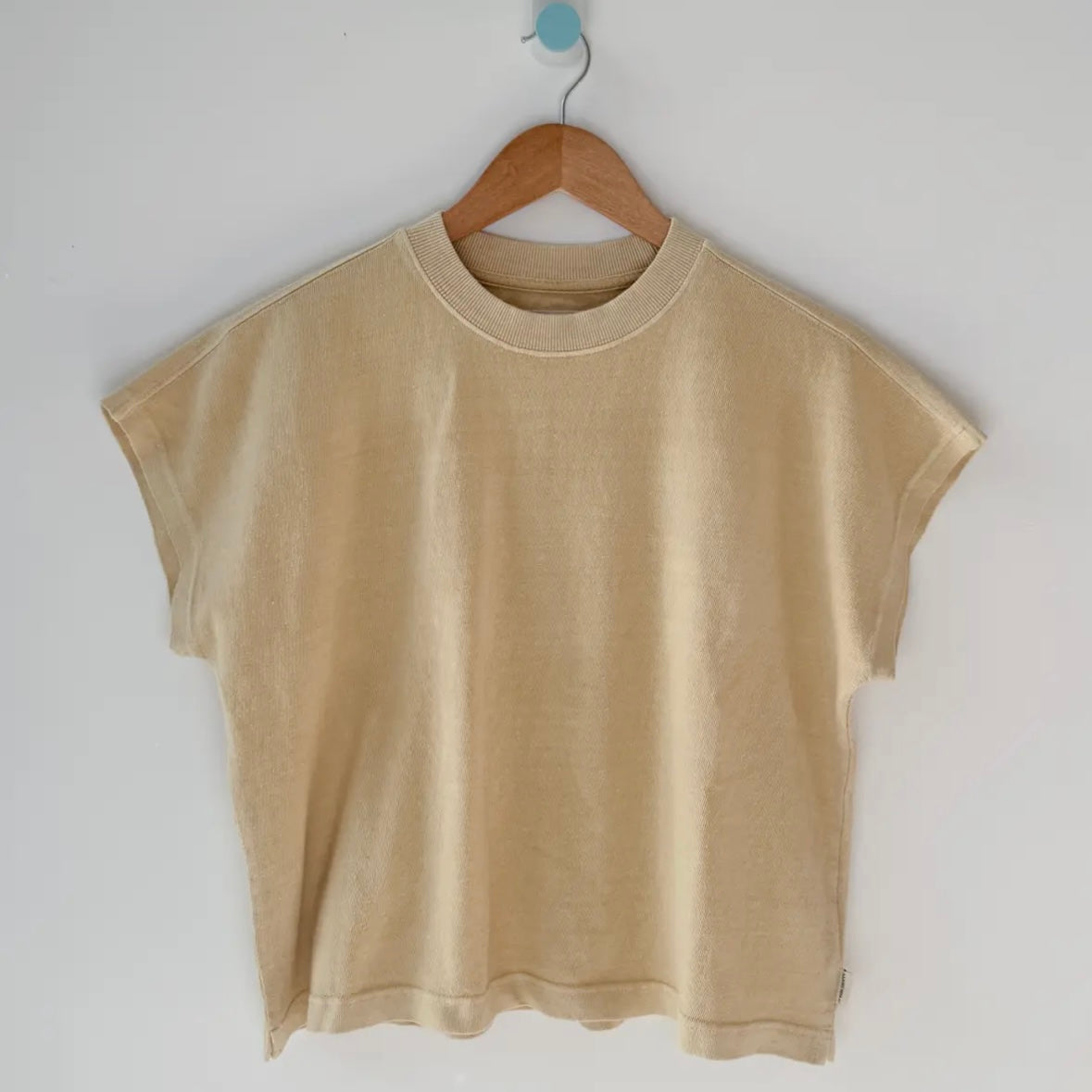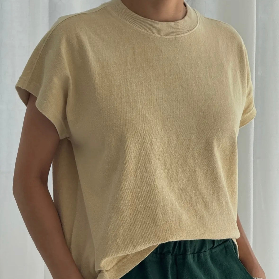 Jeanne Tee is our perfect muscle tee. She features a shorter length to pair perfectly with high waisted bottoms but still give enough coverage for mid-rise bottoms and just the right amount of off shoulder dolman sleeve. She has a high crew neck with an extra wide neckband that adds to her signature charm. Made in South Korea Please note: The dying and washing process gives each garment unique character. Please allow for slight color and fit variation for each garment as is the beauty of garment dye and wash. Pieces with the same color name may not match exactly. Contents: 100% Cotton Heavy Weight Low Gauge Approximate Measurements: XS/S : Chest 22”, Length 21 1/2” M/L : Chest 23 1/2”, Length 22” Model is 5' 6", 110 lbs and wearing a size small