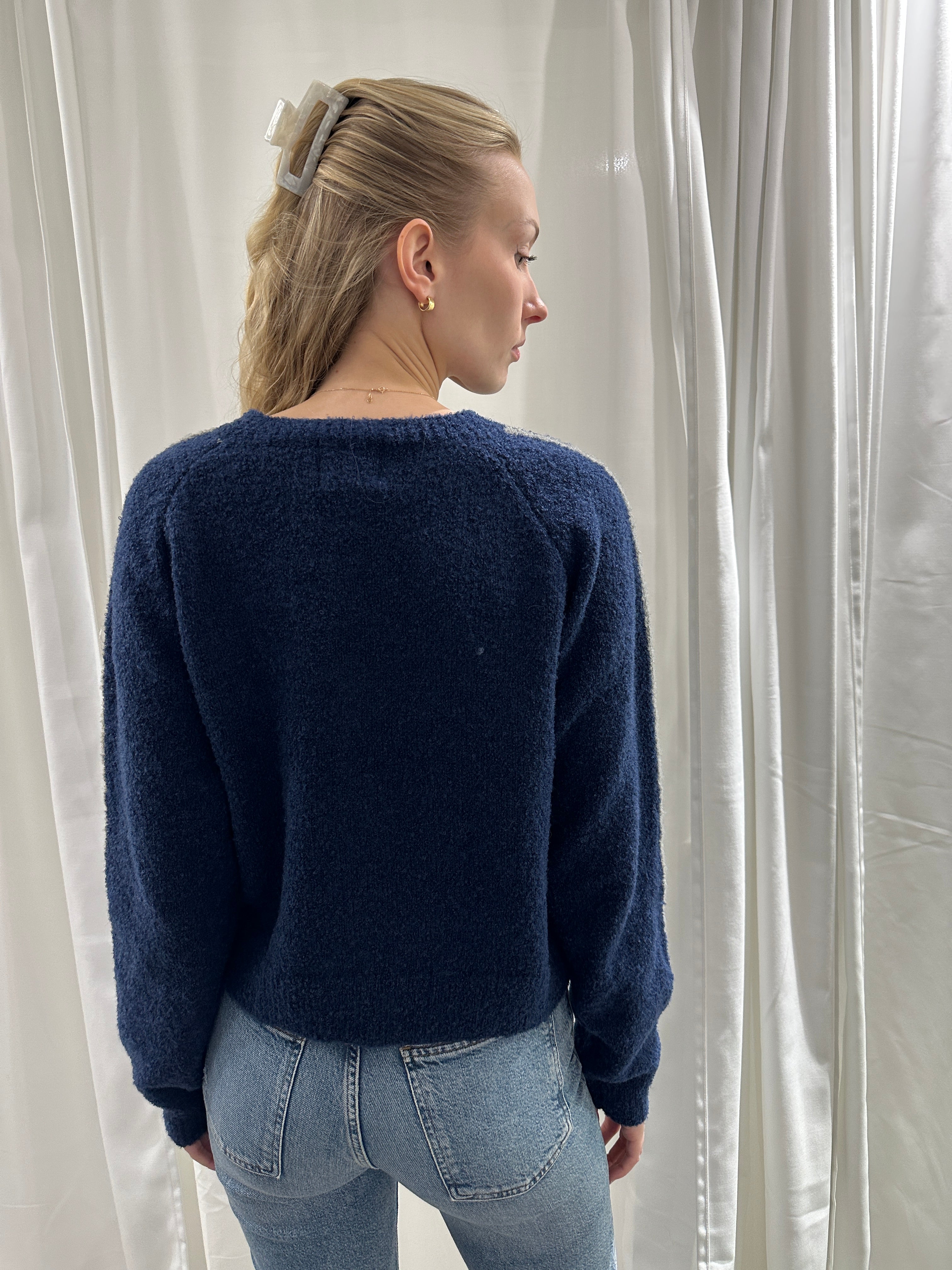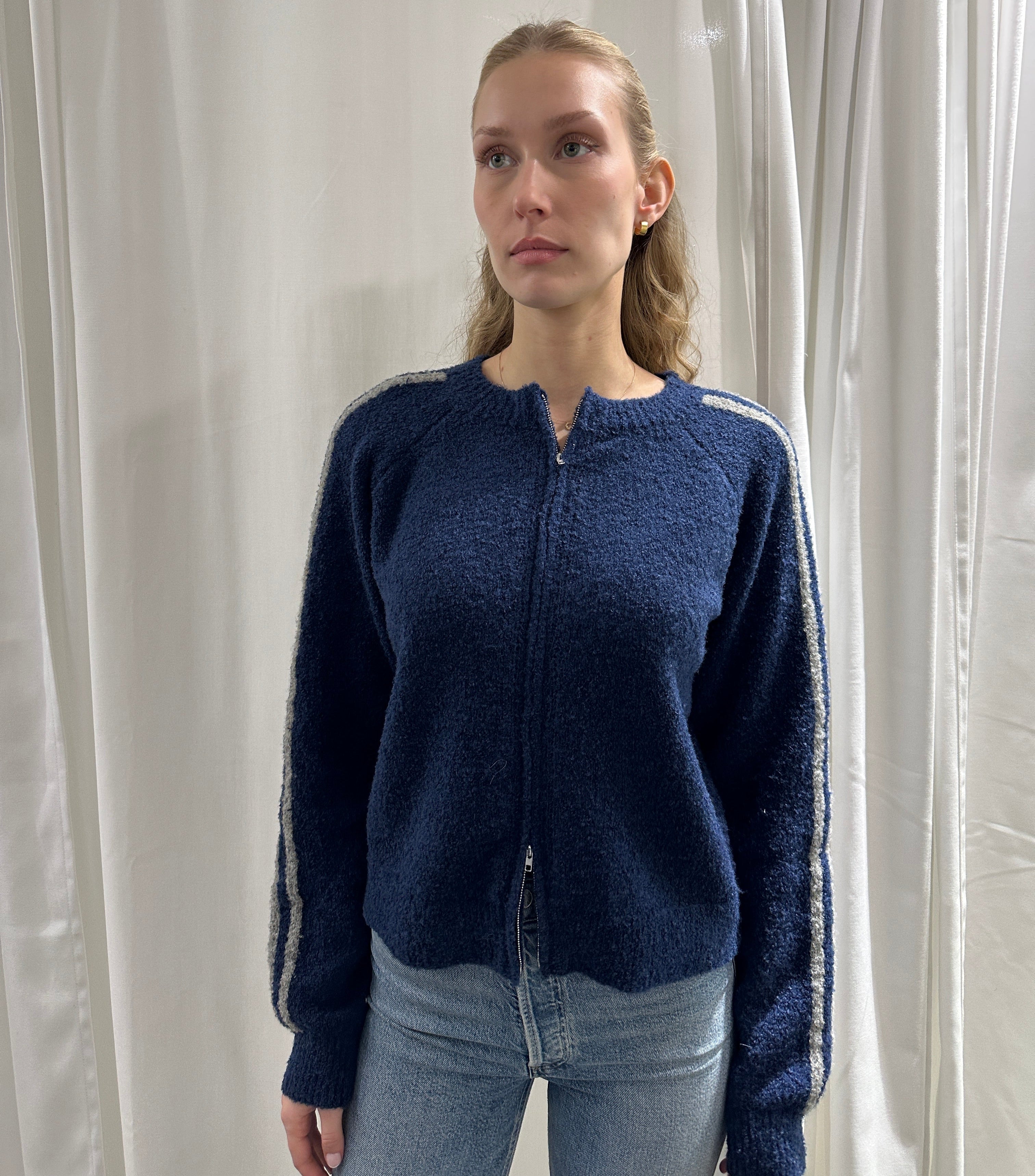 The Reba Sweater is a zip-up jacket knit from midweight bouclé, offering subtle texture and warmth. Featuring a ribbed crewneck, contrast double stripes on the sleeves, and a relaxed fit, it’s perfect for easy layering.