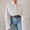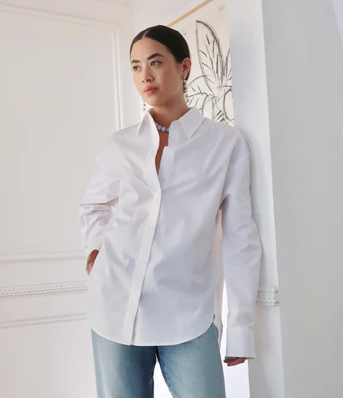 • Oversized tailored shirt with drop shoulder. Box center pleat at back, with rounded hem and extended tail. Shell buttons.