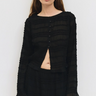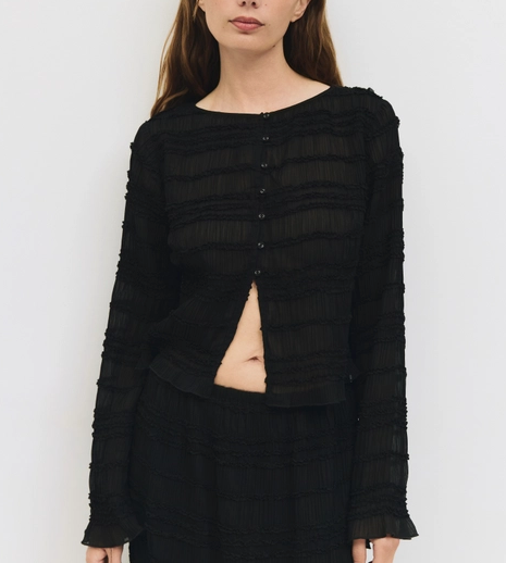 The Mindy Top is crafted from smocked, textured sheer crepe with a relaxed silhouette and long sleeves for a lightweight, airy feel. Featuring a crewneck, partial front buttons, and a bottom front slit,